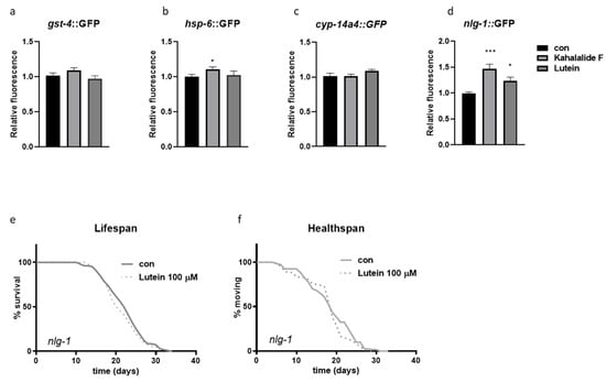 nlg-1 induction mediates lutein’s beneficial effects. (a–d) gst-4, hsp-6, cyp-14A4 and the nlg-1 expression with transcriptional reporter GFP strains. Asterisks (*) denote statistical significance compared to control. Unpaired t-test: * p value ≤ 0.05, *** p value ≤ 0.001. (e) Lifespan, shown as % of surviving animals over time, and (f) healthspan, calculated as % of moving animals, among surviving nematodes, over time in nlg-1 knockout strain upon lutein treatment.