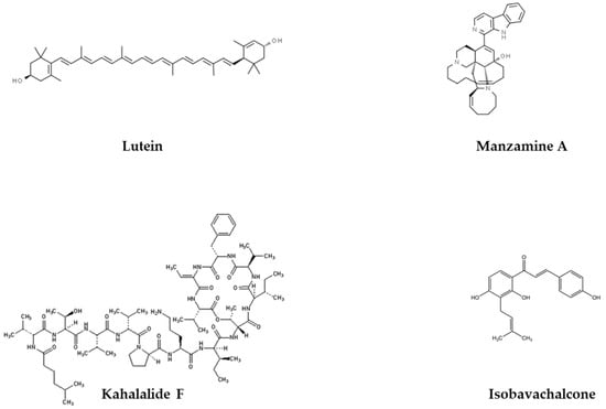 Chemical structures of lutein, kahalalide F, manzamine A and Isobavachalcone (adapted from ChemSpider, IDs 4444655, 32818457, 5006904 and 444667).