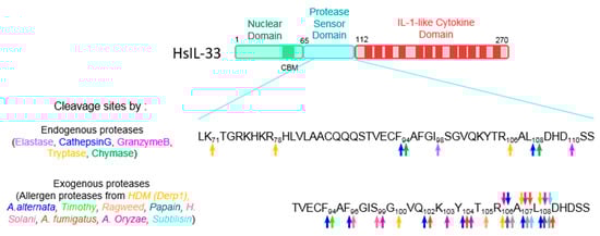 The data obtained with neutrophil, mast cell and allergen proteases clearly show that these “activating” proteases cleave IL-33 in the central domain from residues 72 to 110, which constitutes a true cleavage platform for “activating” proteases, whether endogenous or exogenous (see Figure 2).