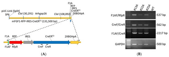 Construction map and genotyping of F1A-CreERT2 transgenic mice. (A) Construction map of F1A-CreERT2 transgenic mice. The transgene of F1A-RFP-IRES-CreERT2 was constructed using mouse Fgf1A promoter including Fgf1A promoter sequence comprising 127.7 kb of upstream sequences, followed by 714 bp of RFP gene sequences, 536 bp of IRES gene sequences, and 2001 bp CreERT2 sequences. Primers designed for genotyping: F1AF, RfpR, CreF and CreR. (B) Genotyping results of three F1A-CreERT2 founders: #13A, #22A and #25A. The amplicon of primer F1AF/RfpR is 537 bp; F1AF/CreR is 2,217 bp, and CreF/CreR is 562 bp.
