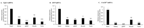 In order to investigate whether the mRNA expression levels of endogenous Fgf1A gene is correlated with expression of RFP and CreERT2 gene, we analyzed the mRNA expression levels in different organs of F1A-CreERT2 transgenic mice (#13A), including heart, kidney, gWAT (gonadal white adipose tissue), muscle and testis. Notably, we found that the heart tissue possessed the highest mRNA expression levels of Fgf1A (Figure 2A), RFP (Figure 2B) and CreERT2 (Figure 2C) genes. In addition, muscle and kidney tissues possessed low mRNA expression levels of Fgf1A gene.