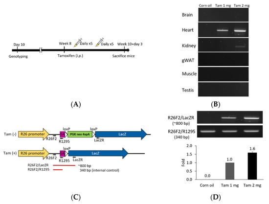 Tamoxifen induction Cre-loxP recombination of F1A-CreERT2 × ROSA26 F1 mice. (A) Eight-week old double-positive F1 mice were injected intraperitoneally with tamoxifen or corn oil vehicle control for 10 days within two weeks. The schematic flow is shown in (A). Tamoxifen was injected in eight-week old mice intraperitoneally with 100 μL/mouse/day at 1 or 2 mg per mouse, during five consecutive days in a week, for a total of two weeks. (B) Tamoxifen-activated Cre-loxP recombination of genomic DNA PCR analysis of gene recombination. (C) The primers used for detection of Cre-loxP recombination. The purple box represents the splicing acceptor site. The white box represents the loxP sequence. (D) PCR results for Cre-loxP recombination of heart tissues. Tam 1 mg: tamoxifen 1 mg per mouse per day, Tam 2 mg: tamoxifen 2 mg per mouse per day.