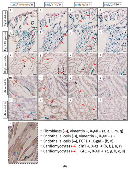 Tissues from mice after intracardial perfusion with ice-cold PBS were fixed in 4% paraformaldehyde (Electron Microscopy Science, Hatfield, PA, USA) for 30 min, equilibrated in 10% (w/w) sucrose for 3 h, then in 30% (w/w) sucrose overnight, and frozen in Optimal Cutting Temperature compound (VWR) at −80 °C before cryosectioning. Ten-μm cryosections were used for X-gal (5-bromo-4-chloro-3-indolyl β-D-galactosidase) staining and immunohistochemistry staining. For X-gal staining, slides were post-fixed with 0.2% paraformaldehyde on ice for 10 min, rinsed in PBS with 2 mM MgCl2 for 10 min twice, in rinse solution for 10 min and then in X-gal solution at 37 °C overnight [27]. The X-gal stained tissue sections were then immunostained with anti-vimentin (1:1000, ARG66199, Arigo Biolaboratories, Wuhan, China), anti-FGF1 (1:70, sc-7910, Santa Cruz Biotechnolgy, Santa Cruz, CA, USA) and anti-cardiac troponin T (1:500, NBP-67594, Novus, St Charles, MO, USA) antibodies. The detection system was used with Leica kit DS9800. For immunofluorescence staining, tissues were fixed with 4% PFA at 4 °C overnight, then fixed with methanol for 15 min at −20 °C. Blocking tissues were done with 10% donkey serum for 45 min at room temperature. Tissues were stained with anti-vimentin (1:1000, ARG66199, Arigo), anti-FGF1 (1:270, #15, IMC-Lab, Zhunan, Taiwan), and anti-cTnT (1:500, NBP-67594, Novus) antibodies. Tissues were incubated with Alexa 488-conjugated donkey anti-rabbit IgG (1:500, Thermo Fisher) for 2 h at room temperature. Hoechst 33258 (200 ng/mL) was used as nuclear counterstain. Tissue slides were mounted with cover-slips and were inspected using BX51 (Olympus, Miami, FL, USA) microscope.