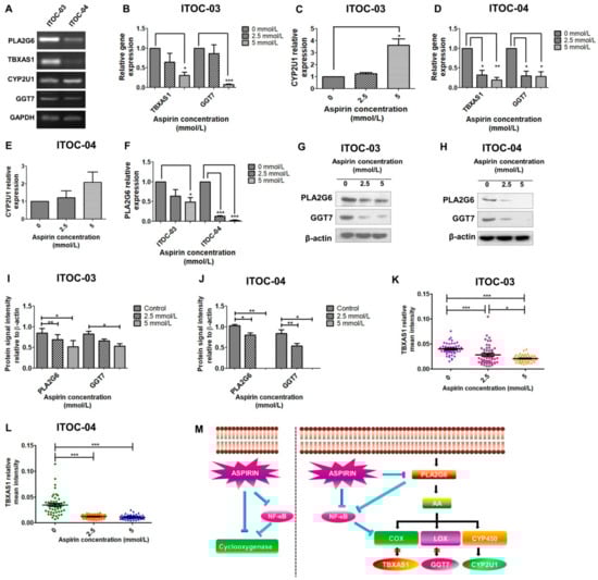 We had previously reported the correlation between loss-of-function mutations in AAM pathway genes with better survival in GB-SCC patients [28]. Here, we evaluated the expression of the 10 AAM pathway genes mutated in GB-SCC - PLA2G3, PLA2G4E, PLA2G4F, PLA2G6, TBXAS1, PTGIS, GGT7, GPX7, CYP2U1, CYP2C19 in these two GB-SCC cell lines. Of these, 4 genes with significant expression in both cell lines (PLA2G6, TBXAS1, CYP2U1, GGT7) were chosen for further experiments (Figure 2A). We observed a dose-dependent inhibition of downstream components of the AAM pathway—TBXAS1 of the COX component and GGT7 of the LOX component (Figure 2B,D) and up-regulation of CYP2U1 of the CYP component of the AAM pathway (Figure 2C,E). The down-regulation of TBXAS1 was expected, as it is downstream of COX, a direct target of aspirin. However, the down-regulation of GGT7, a LOX component, suggested the involvement of an upstream component of the AAM pathway in aspirin-mediated inhibition. We further investigated the effect of aspirin on the upstream PLA2G6 gene belonging to the phospholipase family of the AAM pathway. Interestingly, we found that aspirin inhibits PLA2G6 expression in a concentration-dependent manner (Figure 2F). We further observed down-regulation of PLA2G6, GGT7 and TBXAS1 protein levels on treatment with aspirin (Figure 2G–L, Figures S3 and S4).