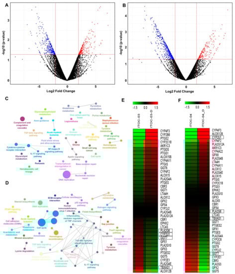 Differential gene expression and pathway enrichment of aspirin-treated GB-SCC cells. (A,B) Volcano plot highlighting significantly altered genes in aspirin-treated ITOC-03 and ITOC-04 cells, respectively. The scattered points on the plot represent genes. Blue dots denote down-regulated genes, red dots denote up-regulated genes, and black dots denote no significant change in gene expression on treatment with aspirin. Pathway enrichment analysis for aspirin-treated (C) ITOC-03 and (D) ITOC-04 cells using the ClueGO plugin in the cytoscape tool. Enriched pathways are displayed as nodes with different colors and only the most significant in the group are labelled. Multi-color nodes depict overlap between the genes. Heatmap depicting alterations in Arachidonic acid metabolism pathway genes in aspirin-treated (E) ITOC-03 and (F) ITOC-04 cells. Untreated cells are denoted as ITOC-03, ITOC-04 and aspirin-treated cells are denoted as ITOC-03_D and ITOC-04_D.
