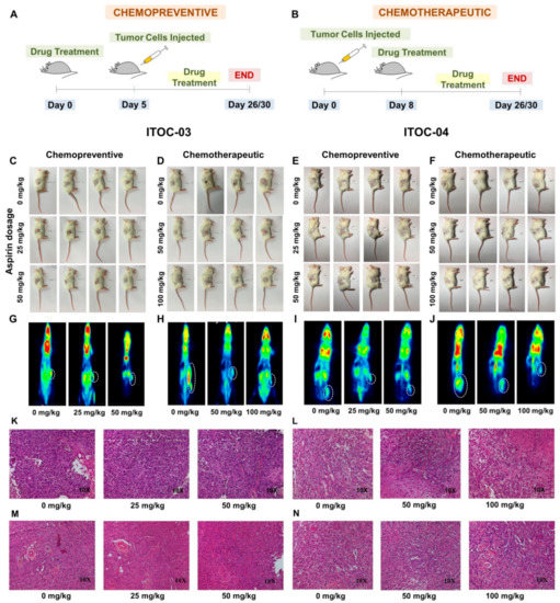 Aspirin suppresses the tumor growth in vivo. (A,B) Schematic representation of the in vivo chemopreventive and chemotherapeutic study in xenografted NOD-SCID mice. In chemopreventive studies, the aspirin treatment was initiated on Day 0 and continued until Day 5. The GB-SCC cells were injected on Day 5 and the aspirin treatment continued until 26 days for ITOC-03 cells and 30 days for ITOC-04 cells. In chemotherapeutic studies, the GB-SCC cells were injected on Day 0 and on initiation of the tumor formation on Day 8, the mice were subjected to aspirin treatment until 26 days for ITOC-03 cells and 30 days for ITOC-04 cells. (C–F) In vivo studies performed on xenografts of GB-SCC cells in presence and absence of aspirin. The mice were subjected to two different dosage regimens of aspirin; chemopreventive (0 mg/kg, 25 mg/kg, 50 mg/kg) and chemotherapeutic (0 mg/kg, 50 mg/kg, 100 mg/kg), n = 4/group. (G–J) Micro PET images of 18-FDG uptake in coronal planes for untreated and aspirin-treated xenografts of GB-SCC cells. (K–N) Microphotographs of H&E stained tumor xenografts captured at 10X magnification.