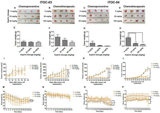 Chemopreventive and chemotherapeutic effect of aspirin on GB-SCC xenografts. (A–D) Photographs of ITOC-03 and ITOC-04 untreated and aspirin-treated tumor xenografts. The effect of different doses of aspirin on (E–H) Tumor weight (I–L) Tumor volume and (M–P) Body weight of mice. One-way ANOVA and Bonferroni post-test were used for statistical analysis, n = 4/group, * p < 0.05, ** p < 0.01, *** p < 0.001.