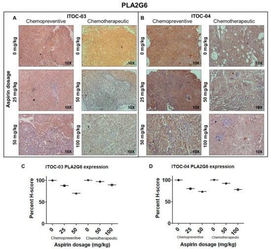 Immunohistochemical detection of PLA2G6 in xenografts generated from subcutaneous transplantation of GB-SCC cells, with or without aspirin. (A,B) PLA2G6 expression and (C,D) Percent H-score of PLA2G6 (n = 4), on treatment with different doses of aspirin; chemopreventive (0 mg/kg, 25 mg/kg, 50 mg/kg) and chemotherapeutic (0 mg/kg, 50 mg/kg, 100 mg/kg) in ITOC-03 and ITOC-04 derived xenografts, respectively.