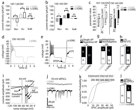 To assess whether enrichment of organoids with IBA1+ cells has the capacity to alter single neuron properties in the developing organoids, we performed whole-cell recordings in acute organoid slices at days 107–120 and days 150–165. The recordings were carried out under voltage-clamp conditions to measure the maximal sodium and potassium (holding voltage—70 mV, test voltage −20 mV and +10 mV, respectively) and passive leak current density (holding voltage—50 mV, test voltage −120 mV) as markers of neuronal maturation and stage of development. Currents recorded were normalised to cell size and expressed as pA current per pF of cell capacitance. We detected a statistically larger potassium current density in (+)ORG at the early time point and a significantly larger mean sodium current density in neurons in (+)ORG at both recorded time points (Figure 3a,b). No changes were seen in the background mean maximal leak current density between the two groups (Figure 3a,b) or basal electrophysiological parameters of the neurons measured under current-clamp conditions (input resistance, resting membrane potential or membrane time constant, Figure 3c). We found that the increased sodium current density translated functionally to a significantly larger prevalence of repetitive action potential (AP) firing neurons in (+)ORG (Figure 3d–f) and a larger, albeit marginally insignificant, prevalence of neurons firing non-adaptively during the current steps (Figure 3g). Moreover, neurons from (+)ORG were more likely to express active ionic currents and, in particular, a presumed low-threshold calcium current often leading to a low threshold potential-spike (LTS), following release from a prolonged hyperpolarisation (Figure 3h,i). Furthermore, we only detected spontaneous excitatory post-synaptic currents (sEPSCs) under voltage-clamp in neurons in (+)ORG but not in (−)ORG (Figure 3j–l).