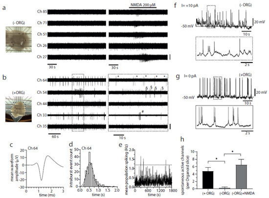 Next, we looked if microglia would boost the emergence of network activity, previously reported in organoids [34]. 3D-MEA electrophysiological recordings were undertaken from acute slices of day 150–165 organoids to examine the developing characteristics of the neuronal network properties. We detected only a single active electrode track with spontaneously occurring multiunit activity from (−)ORG slices, which was in striking contrast to the (+)ORG slices where we detected 24 spontaneously active electrode tracks under basal conditions (Figure 4a,b). (+)ORG slices exhibited activity patterns in active electrode tracks ranging from irregular firing to regular bursting (Figure 4b–d). Such bursting activity could be often discriminated successfully, through principal component analysis, into single unit activity (SUA; Figure 4c) from presumed single neuron firing, but each unit appeared relatively asynchronous in bursting phase to others and thus mean population spiking plots remained flat (Figure 4e) and did not follow any regular oscillatory activity with typical high amplitude peak spiking-low amplitude silent pause features expected from synchronously bursting networks as described before by others [34]. The differences in the prevalence of activity and functional characteristics were not secondary to slice-MEA placement or viability of the neurons as we could reverse the silent electrode tracks of the (−)ORG slices to active by exciting the neurons with the application of NMDA, resulting in the emergence of brief bursting activity (Figure 4a,h). Whole-cell recordings from organoids that have undergone MEA recordings confirmed the presence of bursting neurons from resting (0 pA) or near resting membrane potential (from +2 to +10 pA current injection, Figure 4g) in slices from (+)ORG but rarely from slices of (−)ORG (Figure 4f).