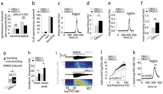 To further elaborate on our functional findings and to ascertain whether the striking differences seen would persist in time, we examined four organoid-slices per group (taken from two different batches) at DIV 200–213 using 3D-MEA techniques coupled to NMDA pharmacology to induce brief periods of persistent neuronal bursting and local field potential (LFPs) oscillations. Unlike our previous results at DIV 150–165, we found a similar number of spontaneously active channels per organoid-slice under both baseline and under induced conditions via NMDA receptor activation (baseline active channels, Figure 5a). We also found only a small minority (circa 5–10%) of spontaneous active channels that exhibited signs of bursting in baseline condition in both phenotypes (Figure 5b) unlike the high burst prevalence in (+)ORG only at DIV 150–165 (Figure 4b) suggesting that time spent in culture reduced the incidence of finding spontaneous bursting channels in our organoids. To understand the developing dynamics of the network, we focused our analysis on the impact of brief NMDA receptor activation (2 min) on spike firing and spike bursting characteristics during our pharmacological experiments. The mean firing rate during NMDA perfusion (2-min average) was significantly higher in (+)ORG phenotype (Figure 5c,d). Burst firing induced by NMDA was significantly higher in (+)ORG phenotype (Figure 5e,f), while we found significantly more bursting channels induced by NMDA superfusion in (+)ORG than in (−)ORG phenotypes (Figure 5g). Further analysis of the NMDA-induced bursting characteristics revealed that (+)ORG exhibited significantly higher, mean and mean peak intra-burst firing frequency (Figure 5h). To probe further the characteristics of the developing network’s behaviour in organoids, we examined NMDA-induced oscillatory activity in different frequency bands by analysing LFPs from NMDA responding channels (n = 44 vs. 66 responding channels for (+)ORG and (−)ORG phenotypes, Figure 5i–k). Power spectral density (PSD) analysis revealed that NMDA induced a strong, but differential enhancement of specific frequencies, especially in the high frequency γ-band (30–100 Hz) range (Figure 5i). We found that PSD induced by NMDA was significantly different between (+)ORG and (−)ORG phenotypes (Figure 5j). In particular, the power of the induced γ-band component of the LFP was highly significant and larger in (+)ORG than (−)ORG slices (Figure 5k).
