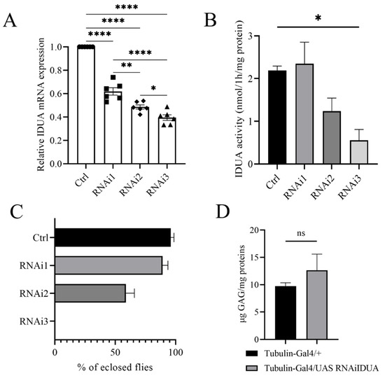 To evaluate the biological function of D-idua we analyzed the in vivo effects associated with D-idua downregulation. The genetic reduction was assessed by knocking-down D-idua using the RNAi approach and the UAS-Gal4 system [44]. The inspection of the VDRC (Vienna Drosophila Stock Center) highlighted three UAS RNAi lines available: 13244/GD hereafter referred to as D-iduaRNAi1, 103771/KK (D-iduaRNAi2), and 13245/GD (D-iduaRNAi3) (Table 1). Using Tubulin-Gal4, a strong ubiquitous driver line, in combination with the three RNAi lines, D-idua knockdown was shown to be effective to a different extent. In particular, with D-iduaRNAi1, D-iduaRNAi2, and D-iduaRNAi3 in combination with Tubulin-Gal4, expression was reduced by 39%, 53%, and 61%, respectively (Figure 2A). The enzymatic activity was correlated with D-idua mRNA expression, with no changes in the IDUA activity when D-iduaRNAi1 was used, a reduction to half with D-iduaRNAi2, and a reduction to one-third with D-iduaRNAi3 (Figure 2B). Consequently, we observed different lethality levels: D-iduaRNAi1 expression showed no obvious altered phenotype, with an eclosion rate similar to that of control flies; D-iduaRNAi2 expression caused partial lethality at the pupal stage, with almost 70% of escapers, and D-iduaRNAi3 expression caused complete lethality at the pupal stage, with no flies reaching the adult stage (Figure 2C). Since D-idua knockdown was most effective and showed the strongest in vivo phenotype with D-iduaRNAi3, this strain was selected for all further analyses. We next analyzed GAG deposits, a hallmark of MPS, commonly registered in human cells, in the MPS I mouse model [38], as well as in the Drosophila models of other MPS [19,24]. Interestingly, we observed an increased, although not significant, GAG level in comparison to controls (Figure 2D). This might be due to the residual enzyme activity still present in the knockdown model or due to the time of analysis in the larval stage, where GAG deposits may not be significantly established yet (Figure 2D).