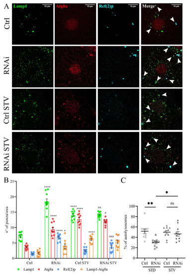 All Drosophila Strains are reported in Table 1. Fly stocks were raised on standard medium [36] and in standard light and temperature conditions. Gal4/UAS crossings were performed at 28 °C. The recombinant line UAS-GFP-Lamp1;mcherry-Atg8a was generated in our laboratory. The control genotype (w1118) was crossed with the drivers. For each experiment, groups comprising 50% of males and 50% of females were analyzed.