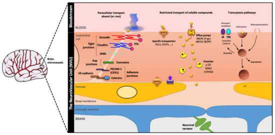 The identification of BBB TJs proteins followed their study in various tissues with TJs and particularly the intestinal epithelium. Occludin [47] was identified first, followed by claudins [48,49] with a majority expression of claudin-5 in TJs of brain capillaries [50,51]. Occludin and Claudin-5 are two transmembrane integral proteins that form the intercellular link between two adjacent ECs. Tricellulin, identified in 2005, completes the composition of TJs at areas of tricellular contact [52]. TJs proteins are anchored to the actin cytoskeleton via Zonula Occludens (ZOs) proteins, mainly ZO-1 [53,54,55]. Basolateral adherens junctions (AJs) with cadherin-5 or vascular endothelial-cadherin (VE-cadherin) as main representative protein [56,57] and medial junctional adhesion molecules (JAMs) complete the junctional complexes exposed by brain capillary ECs and have been well described elsewhere [1,58,59,60]. Thus, also in connection with the low rate of non-specific transcytosis, all these junctional complexes drastically restrict the paracellular passage of soluble blood compounds, circulating microvesicles and cells such as circulating lymphocytes or macrophages, which can only cross the BBB in response to inflammation of the brain compartment [61,62,63,64].