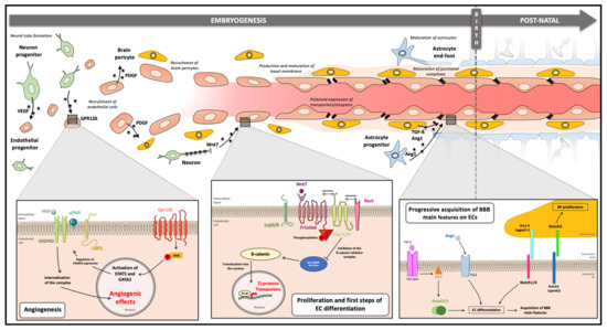 During the cerebral vascularisation, endothelial progenitor cells (EPCs) migrate into the neuroectoderm following the gradient of a vascular endothelial growth factor (VEGF) secreted by neural progenitors. VEGF binds to the EC receptor VEGFR2 (flk-1/KDR), whose expression is modulated by the recently discovered receptor G Protein-coupled Receptor 126 (GPR126). The binding of the ligand to its receptor promotes a dimerisation and phosphorylation on a tyrosine kinase site that allows the recruitment of the urokinase plasminogen activator receptor (uPAR) by integrins β1 [92]. uPAR acts as an adaptor to bring the low-density lipoprotein receptor-related protein 1 (LRP1) within this complex to induce its internalisation necessary for the activation of several signalling pathways involved in cell proliferation, such as the MAPK/ERK pathway [92,93,94]. This angiogenesis process is based on the activation of several signalling pathways, the best known of which being the Wingless Int (Wnt) pathway. Canonical Wnt signalling is involved in the stimulation of target genes, including genes for BBB phenotype in ECs. After binding of the Wnt ligand—Wnt7a and b—secreted by neuronal precursors, a complex cellular cascade is activated involving Frizzled receptors that form a complex with LRP5/6 coreceptors. Recently, new proteins have been discovered in this protein binding process, the G protein-coupled receptor GRP124, and the Reversion-Inducting-Cysteine-Rich protein (Reck), both aiming to stabilise and activate the ligand-receptor complex [95,96,97]. This multi-protein complex promotes the stabilisation of ß-catenin, a protein that acts as a transcription factor in the cell nucleus. Thus, transcription of several genes required for the formation of TJs is promoted, such as gene coding for claudin-3 and claudin-5 proteins, and those involved in vesicular transport are inhibited Plasmalemma vesicle-associated protein (PLVAP) [98,99,100]. Moreover, the Wnt pathway promotes the expression of BCRP, an efflux pump present since embryogenesis [101], but also of PDGF-β (platelet-derived growth factor-β), a factor involved in the recruitment of another cell type, the BP [102].