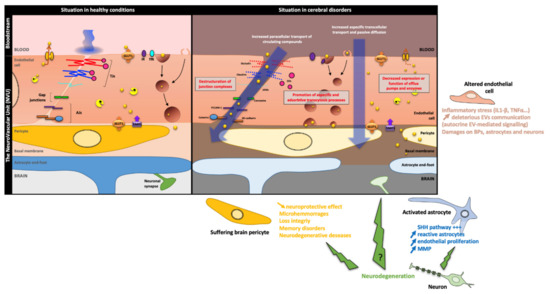 The astrocyte, which has in a physiological condition a protective role of the BBB phenotype, has an antagonistic role in pathological situations. In AD, a breakdown of the BBB is observed in the early stages of the disease, and this breakdown is one of the major causes of cognitive decline. The accumulation of Aβ peptide, a major phenomenon in this pathology, induces the accumulation of reactive astrocytes. Thus, reactive astrocytes secrete factors promoting endothelial proliferation, such as VEGF, but also induce the expression of MMPs, thus altering the integrity of the BBB [160]. The loss or modification of cell–cell communication between astrocyte and BPs leads to the activation of cyclophilin-A in BPs, which promotes MMP9 expression. This altered communication within the NVU indirectly provokes TJs progressive disruption as well as a destabilisation of the basement membrane [161].