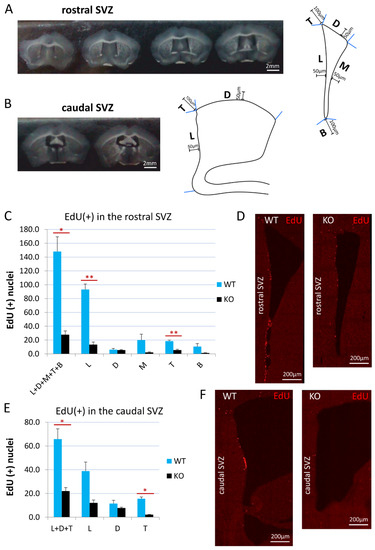 Cyclin D2 KO mice present significantly reduced proliferation activity in the SVZ. (A,B) Coronal sections of the (A) rostral and (B) caudal compartments of the subventricular zones along anterior–posterior brain axis, and schemes of the (A) rostral, and (B) caudal SVZ compartments. The distances of 100 μm and 50 μm demarcate the thicknesses of the SVZ region taken for quantitative analyses of cell numbers. (C,E) Cyclin-D2-deficient mice show significantly reduced numbers of proliferating cells [(EdU(+) nuclei] in the whole SVZ—subregions: L+D+M+T+B (p = 0.024) in the (C) rostral compartment, and L+D+T (p = 0.0266) in the (E) caudal compartment, compared to WT mice. In detailed analyses, cD2-KO mice show reduced numbers in the lateral wall (L, p = 0.0036) and the top cone (T; p = 0.0023) in the (C,D) rostral part, and in the top cone (T, p = 0.0121) of the (E,F) caudal SVZ, compared to WT mice. There were no significant differences in the other subregions: in the rostral SVZ (the D, p = 0.7755; the M, p = 0.1721; the B, p = 0.1724), and in the caudal SVZ (L, p = 0.0626; D, p = 0.3053). Abbreviations: L—the lateral wall; D—the dorsal wall; M—the medial wall; T—the top cone; B—the bottom cone. Data are shown as mean ± SD (* p ≤ 0.05, ** p ≤ 0.01).