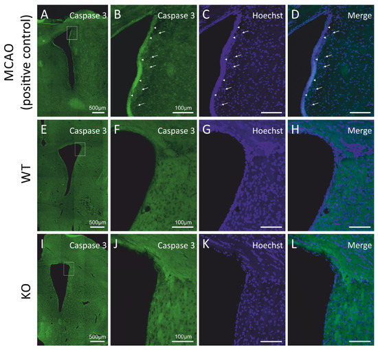 We asked if the decrease in the number of newly generated cells occurring in the subventricular neurogenic niches of the cD2-KO mice might be caused by elevated cell death. In order to quantify the progress of programmed cell death, we evaluated the apoptosis levels by measuring the presence of activated (cleaved) caspase-3, a classical hallmark of the medial and final stages of apoptotic cell death, using the immunodetection of activated caspase-3, and did not observe any positive cells in the cD2-KO or WT mice (see Figure 2I–L and Figure 2E–H, respectively). To validate the applied antibody and experimental approach to detect apoptotic cells, we used a positive control—complementary rat brain sections obtained from animals after middle cerebral artery occlusion (MCAO; for reference, see Material and Methods and [28]), a classic model of brain ischemia. It is widely reported in the literature that this procedure results in robust apoptotic cell death in the infarct area. We processed the MCAO brain sections simultaneously during the immunohistochemical detection of cleaved caspase-3, along with a series of sections from the cD2-KO and WT mice. An epifluorescence microscopic analysis revealed immunopositive cells in the MCAO-subjected tissue, but no labelled cells in the SVZs in the brains of the cD2-KO and WT mice (Figure 2A–L). Thus, it can be concluded that upregulated apoptosis is not an accompanying process in the SVZs and the neighboring areas in the cD2-KO mice, which is responsible for the lowered number of newly generated cells in comparison to the untreated WT mice.