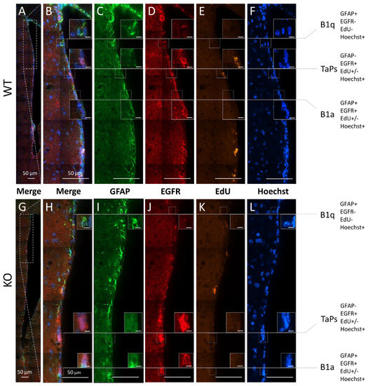 Subpopulations of precursor and progenitor/neural stem cells in the subventricular zone revealed by the combinatory multiple-epitope detection (confocal microscopy) of cellular markers and stainings. Immunoreactivity of GFAP (green) and EGFR (red). The detection of EdU-labelled proliferative cells (yellow) and Hoechst-staining-labelled cell nuclei (blue) were used to phenotype the precursors and progenitors in the dorso–ventral axes along the lateral walls of the SVZ neurogenic niches in the (A–F) WT and (G–L) cD2-KO mice: B1 quiescent precursors (B1q): GFAP(+), EGFR(−), EdU(−), and Hoechst(+); B1 active precursors (B1a): GFAP(+), EGFR(+), EdU(+) or EdU(−), and Hoechst(+); transit-amplifying progenitors (TaPs): GFAP(−), EGFR(+), EdU(+) or EdU(−), Hoechst(+), and “Others”: GFAP(−), EGFR(−), EdU(+) or EdU(−), and Hoechst(+) (not shown). EdU—(5-ethynyl-2′-deoxyuridine)-labelling of proliferating cells; EGFR—epidermal growth factor receptor; GFAP—glial fibrillary acidic protein; Hoechst—dye for nuclei staining. Scale bar in small inserts of 5 µm.