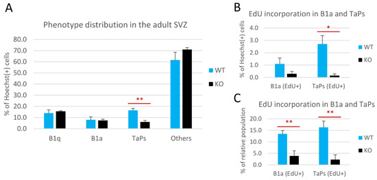 Cyclin D2 deficiency affects transition from B1 active precursors to transit-amplifying progenitors (TaPs) in the adult subventricular zone (SVZ). (A) Phenotypic distributions of cells, and (B,C) proliferating activity of the B1a and TaPs in the SVZs in cD2-KO and WT mice. Cyclin D2 deficiency impacts (A) [graph—all B1a and all TaPs, both EdU(−) and EdU(+)] the transition from B1a to TaPs, and (B,C) [graphs—B1a and TaPs EdU(+) only] reduces the number of actively proliferating B1a and TaPs. The % of the relative population describes the percentage within specific cell subpopulations (B1a or TaPs). EdU—(5-ethynyl-2′-deoxyuridine) labelling of newly generated cells. Data are shown as mean ± SD (* p ≤ 0.05, ** p ≤ 0.01).