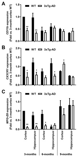 Microglial typical markers are decreased in the brain cortex and hippocampus of the 3-month-old 3xTg-AD mice. Samples from the wild-type (WT) and 3xTg-AD animals were collected at 3-, 6- and 9-month-old and analyzed for (A) CD11b, (B) CX3CR1 and (C) MFG-E8 mRNAs by RT-qPCR. Results are mean ± SEM, representative of n = 4 animals per experimental group, and are expressed as fold change vs. 3-month-old cortex WT mice. * p < 0.05 and ** p < 0.01 vs. respective WT, two-tailed Student’s t-test.