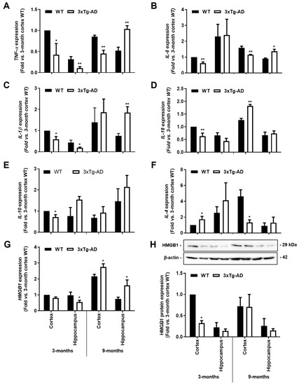 Gene expression levels of pro-inflammatory cytokines are reduced in the 3xTg-AD animal model at the early stage, but some of them increase with disease progression. Brain samples from wild-type (WT) and 3xTg-AD animals were collected at 3 months and analyzed for (A) TNF-α, (B) IL-6, (C) IL-1β, (D) IL-18, (E) IL-10, (F) IL-4 and (G) HMGB1 mRNA expression by RT-qPCR, as well as for (H) representative Western blot for HMGB1 protein expression levels and respective quantification. Results are mean ± SEM, representative of n = 4 animals per experimental group, and are expressed as fold change vs. WT mouse cortex at 3-month-old. * p < 0.05 and ** p < 0.01 vs. respective WT, two-tailed Student’s t-test.