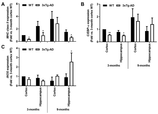 Microglia-associated MHC-II and C/EBP-α pro-inflammatory markers are downregulated in the hippocampus and cortex from the 3-month-old 3xTg-AD mice, while iNOS induction is apparent in 9-month-old hippocampal mouse samples. Brain samples were collected from wild-type (WT) and 3xTg-AD animals at 3 and 9 months and analyzed for (A) MHC-II, (B) C/EBP-α and (C) iNOS mRNA expression by RT-qPCR. Results are mean ± SEM, representative of n = 4 animals per experimental group, and are expressed as fold change vs. 3-month-old cortical tissues from the WT mice. * p < 0.05 and ** p < 0.01 vs. respective WT, two-tailed Student’s t-test.
