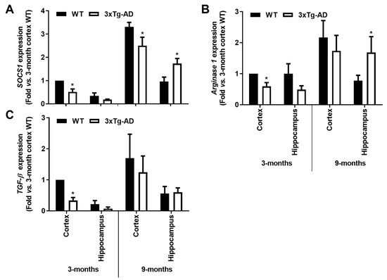 Microglia-associated SOCS1 and Arginase 1 anti-inflammatory markers are downregulated in the cortex from the 3-month-old 3xTg-AD mice but upregulated in the 9-month hippocampal samples, with a further TGF-β decrease in the first. Brain samples were collected from wild-type (WT) and 3xTg-AD animals at 3 and 9 months and analyzed for (A) SOCS1, (B) Arginase 1 and (C) TGF-β mRNA expression levels by RT-qPCR. Results are expressed in graph bars as mean ± SEM, representative of n = 4 animals per experimental group and expressed as fold change vs. 3-month-old cortical tissues from the WT mice. * p < 0.05 vs. respective WT, two-tailed Student’s t-test.