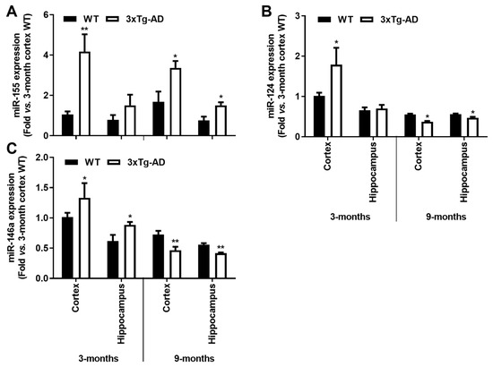 Upregulation of inflammatory-associated miRNAs is a common feature in the brain cortex at the early-AD stage of the 3xTg-AD mice, and a single elevation of miR-155 characterizes both cortex and hippocampus at 9 months. Brain samples from wild-type (WT) and 3xTg-AD animals were collected at 3 and 9 months and analyzed for (A) miR-155, (B) miR-124 and (C) miR-146a expression levels by RT-qPCR. Results are expressed as mean ± SEM, representative of n = 4 animals per experimental group and expressed as fold change vs. 3-month-old cortical tissues from the WT mice. * p < 0.05 and ** p < 0.01 vs. respective WT, two-tailed Student’s t-test.