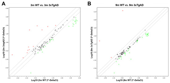 Scatter plot representation of the expression of miR-155 targets in 3xTg-AD vs. wild-type (WT) mice. RNA was isolated from cortical brain samples of WT and 3xTg-AD animals at 3- (A) and 9-month-old (B) and analyzed for the expression of miR-155 target genes by RT-qPCR. Results are expressed as Log10 gene expression from a pool of n = 4 animals per experimental group.