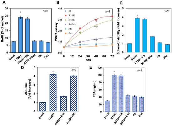 To evaluate the mitogenic effect of androgen in 2D and 3D cultures, BrdU incorporation and proliferation were assayed. R1881 was stimulated by about threefold the number of cells incorporating BrdU, as compared to unstimulated (basal) cells. While enzalutamide completely impaired the R1881-elicited effect, the Rh-2025u peptide had no effect on the DNA synthesis stimulated by the androgen. Enzalutamide and the stapled peptide did not significantly affect the BrdU incorporation when used alone, as controls (Figure 2A). Similar data were obtained using 10 nM DHT (Figure S1A). WST-1 assay was performed for evaluating the effect of R1881 on cell proliferation. R1881 treatment stimulated the proliferation of LNCaP cells, with an effect already evident after 24 h. Also in this case, enzalutamide inhibited the androgen-elicited effect, which persisted until 72 h of treatment, while the stapled peptide did not significantly affect the R1881-induced proliferation. Here again, enzalutamide and the stapled peptide left unaltered the cell proliferation, when used alone, as controls (Figure 2B).