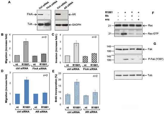 3.5. Filamin A and AR Are Both Required for LNCaP Cell Motility Induction by a Mechanism Involving Rac Activation and Fak Phosphorylation