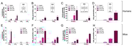 Biosynthesis of AA-derived eicosanoids from human and mouse eosinophils. EOS suspensions (5 × 106 cells/mL, 37 °C) were treated with DMSO or increasing concentrations of AA for 15 min. Incubations were stopped by adding one volume of cold (−20 °C) MeOH containing internal standards. Samples were then processed and analyzed for eicosanoids by LC-MS/MS, as described in Materials and Methods. (A–D) Results are the mean (±SEM) of 6 independent experiments using human eosinophils from asthmatic donors. (E–H) Results are the mean (±SEM) of 7 independent experiments using bone marrow-derived mouse eosinophils.