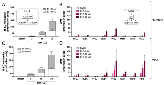 Biosynthesis of docosanoids by human and mouse eosinophils. EOS suspensions (5 × 106 cells/mL, 37 °C) were incubated with DMSO or increasing concentrations of DHA for 15 min. Incubations were stopped by adding one volume of cold (−20 °C) MeOH containing the internal standards. Samples were then processed and analyzed for docosanoids by LC-MS/MS as described in Materials and Methods. (A,B) Results are the mean (± SEM) of 5 independent experiments using human eosinophils from asthmatic donors. (C,D) Results are the mean (±SEM) of 7 independent experiments using bone marrow-derived mouse eosinophils.
