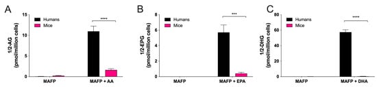 Endocannabinoids are eicosanoids exerting numerous anti-inflammatory effects, at least in mice [11,12]. The two endocannabinoids, 2-arachidonoyl-glycerol (2-AG) and N-arachidonoyl-ethanloamine (AEA), contain an AA moiety in their structure and are part of two major lipid classes belonging to endocannabinoidome, monoacylglycerols and the N-acyl-ethanolamines [42]. Importantly, 2-AG is rapidly hydrolyzed into AA by hEOS [14,43]. However, we can prevent such hydrolysis with serine hydrolase inhibitors such as MAFP, which allows correctly assessing unsaturated fatty acid-induced biosynthesis of 2-AG and other monoacylglycerols [44]. As expected, in the presence of MAFP, hEOS biosynthesized 2-AG, 2-EPG and 2-DHG in response to AA, EPA and DHA, respectively (Figure 4), to comparable levels of what we previously documented [44]. mEOS also biosynthesized these three monoacylglycerols in response to exogenously added fatty acid but to a much lower extent (Figure 4), indicating that mEOSs display a significantly lower monoacylglycerol biosynthetic capability than hEOS. Compared to mEOS, hEOS produced 7-times more 2-AG, 14-times more 2-EPG and 98-times more 2-DHG.