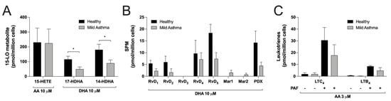Data from Figure 1, Figure 2, Figure 3, Figure 4 and Figure 5 were obtained using hEOS from mild asthmatics to ensure we had a sufficient number of EOS to perform experiments with each fatty acid. However, in order to validate our findings, we compared the ability of hEOS from mild asthmatics with those from healthy volunteers in a limited number of experimental conditions. While we observed a trend toward lower levels of eicosanoids, docosanoids and SPMs in mild asthmatic vs. healthy donors, this difference only reached statistical significance for 14-HDHA and 17-HDHA (Figure 6A,B). The combination of PAF/AA had the same impact on LT biosynthesis regardless of disease status (Figure 6C).