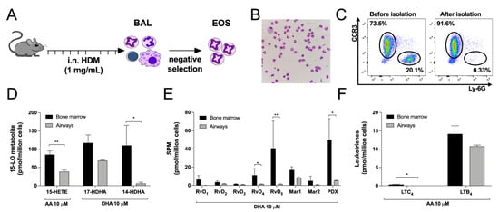 Due to the face that data from Figure 1, Figure 2, Figure 3, Figure 4 and Figure 5 were generated using bone marrow-derived mEOS, we next assessed if we would obtain the same biosynthetic profile using lung mEOS. Thus, we utilized a model of HDM-exposed mice that develops severe eosinophilia in the lungs [46] (Figure 7A). After enrichment, mEOS isolated from the airways of HDM-exposed mice represented 86.74 ± 1.61 of our suspension, the major contaminants being macrophages (4.68 ± 0.15%), lymphocytes (including B, T and NK cells) (7.40 ± 1.14%) and neutrophils (1.21 ± 0.44%) (Figure 7B,C). When compared to bone marrow-derived mEOS, the ability of airway mEOS to biosynthesize eicosanoids and docosanoids was lower and reached statistical significance for 15-HETE, 14-HDHA, RvD4, RvD5, PDX and LTC4 (Figure 7D–F). Of note, Cys-LT biosynthesis was even lower despite the location of mEOS in the airways.