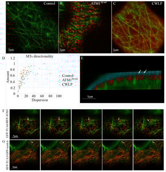 Coordinated organization of ATM1IQ-tail and cortical MTs. 35S-GFP-TUA6 expressing N. benthamiana plants (A) were infiltrated with 35S-mCherry-ATM1IQ-tail (B) or CWPL-RFP (C). Confocal microscopy was performed 48 h after Agrobacterium infiltration, for imaging the abaxial side of epidermal cells. (D) MTs orientations were determined by the directionality plugin of ImageJ in 25–40 cells. Amount refers to the fraction of MTs and dispersion to the distribution of different angles. (E) Z-axis view of a N. benthamiana epidermal cell labeled with FM4-64 (blue), ATM1IQ-tail (red-arrows), MTs (green). (F) Five frames (2 sec intervals) from Movie S2 showing a shift (arrows) in MT orientation after a collision with ATM1IQ-tail cluster in N. benthamiana epidermal cells expressing GFP-TUA6 and mCherry ATM1 IQ-tail. (G) Five frames (2 sec intervals) corresponding to Movie S3 showing a shift (arrows) of orientation of mCherry-TUA5 labeled MT after a collision with GFP-remorin 6.6 labeled structure in A. thaliana epidermal cell.