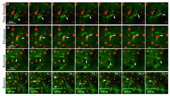 3.2. Collision of MTs with ATM1IQ-tail Clusters Can Result in Cross Over, Reduced Elongation Rate, Detachment and Reorientation or Retraction