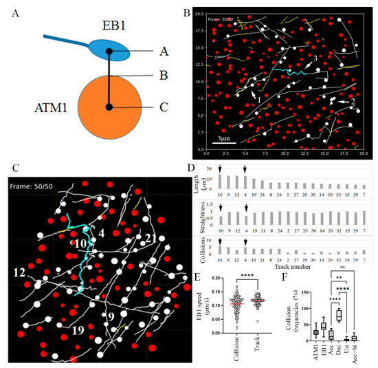 A simulation tool was developed using Python script, which provided data as well as animation that helped focus on selected tracks. Track and spot statistical data from Imaris were used to draw the EB1 tracks (yellow lines or white lines for tracks that encountered collisions) and ATM1IQ-tail spots (red circles or white circles for spots that encountered collisions). The simulation tool also enabled focusing on one selected track by using a different color and line width. In addition to statistical data from Imaris, the simulation enabled us to provide the following information: Collision distance—the distance between the border of the ATM1IQ-tail spot and the center of the EB1 signal for each pair of EB1 signal and ATM1IQ-tail spot (colliding pair) in all frames. The border of the ATM1IQ-tail spots was estimated by using the “different spot diameters” option in Imaris. Whenever the distance was below the ATM1IQ-tail spot radius plus a certain value (a configuration parameter usually chosen to be ≤100 nm according to [39,40]), we considered it to be a collision, and the colliding pair was highlighted. The simulation provided the following measurements: (1) The number of collisions per EB1 track and (2) per ATM1IQ-tail spot, and (3) the percentage of colliding tracks or spots out of total in the field captured. (4) The speed of the EB1 tracks near the collision (near collision duration was set by two configuration parameters—the number of frames before and after the collision time frame, here used one frame before and three after). (5) The difference between the speed and straightness of the EB1 track before and after the collision compared to the whole track. (6) The number and percentage of EB1 tracks that went through acceleration or deceleration or not affected after colliding, compared to the average speed of the whole track. (7) Percent acceleration events that were associated with a decrease in straightness. (8) Maximal lateral displacement from initial position of ATM1IQ-tail spots.