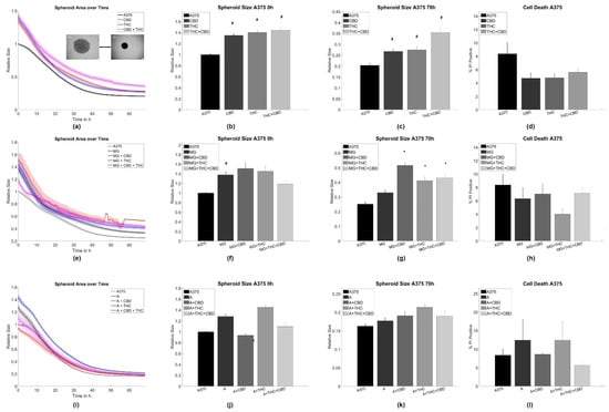 Interestingly, both CBD and THC alone inhibited spheroid aggregation in terms of spheroid size in pure A375 melanoma and LN229 GBM cell cultures (Figure 1a–c and Figure 2a–c).