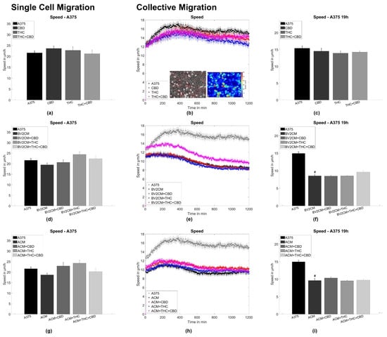 To assess single tumor cell motility, the application of both CBD and/or THC alone or in combination with BV2 and astrocyte supernatants was performed, corresponding to the same groups as for the spheroid formation assay. Thereby, no statistically significant difference for A375 melanoma and LN229 GBM cells was found (Figure 3a,d,g and Figure 4a,d,g). Next, the collective migration speed of both cell types was analyzed in a dense monolayer under the same conditions. Again, cannabinoids alone did not influence the mean layer migration speed (Figure 3b,c and Figure 4b,c), but the supernatants of both BV2 cells and astrocytes reduced layer speed to 55–65% of the control levels for both tumor types. Notably, this effect was not significantly altered after the addition of both cannabinoids (Figure 3e,f,h,i and Figure 4e,f,h,i).
