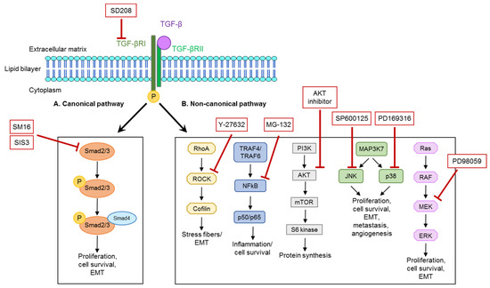 TGF-β mediates its downstream effects through canonical and non-canonical pathways [15,16]. The canonical pathway acts through the phosphorylation of SMAD2 and SMAD3 (SMAD-dependent pathway). The non-canonical signaling is mediated via different pathway routes that include RhoA/ROCK, NFκB, PI3K/AKT, JNK/p38, and the Ras-dependent MEK pathways [29].
