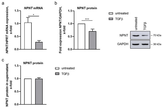 Treatment with TGF-β for 16 or 24 h decreased NPNT mRNA and protein levels in human podocytes, respectively (Figure 2a,b). NPNT is an extracellular protein that is deposited in the glomerular basement membrane. Thus, a reduction in NPNT protein after TGF-β stimulation could have been due to an increase in NPNT secretion. Therefore, we analyzed NPNT protein concentration in the cell culture supernatant of human podocytes after stimulation with TGF-β. While we were able to detect NPNT protein in the podocyte cell culture supernatant, both with and without TGF-β treatment, no significant difference was discovered (Figure 2c). Furthermore, TGF-β did not significantly influence the NPNT protein half-life in the presence of CHX (Figure S1b).