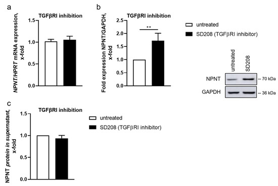 TGF-β binds to a TGF-β receptor type II dimer on the cell surface, which recruits a type I receptor (TGF-βR1) dimer, forming a hetero-tetrameric complex with the ligand [27]. To inhibit intracellular TGF-β signaling, we incubated human podocytes with a TGF-βR1 inhibitor (SD208). SD208 is an ATP-competitive TGF-βR1 inhibitor without activity against other related kinases [18,28]. In the presence of SD208, NPNT mRNA levels were comparable to control cells (Figure 3a). However, NPNT protein expression increased significantly after inhibition of TGF-βR1 (Figure 3b), while inhibiting the receptor did not affect NPNT secretion (Figure 3c), indicating that NPNT is predominantly regulated post-transcriptionally under baseline conditions.