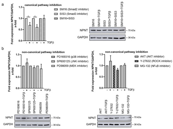 In contrast, the inhibition of SMAD2 and SMAD3 only marginally upregulated NPNT protein expression in podocytes (Figure 4d). Thus, we conclude that, under baseline conditions, the non-canonical pathways have more impact on NPNT protein expression than the canonical pathway. The different findings in NPNT mRNA and protein suggest that the TGF-β-dependent downregulation of NPNT via the non-canonical pathways is mediated post-transcriptionally.