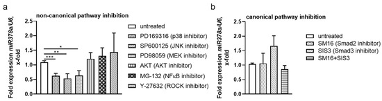 Due to the disparate findings in NPNT mRNA and protein expression in the aforementioned experiments, we suspected that miRs, upregulated upon stimulation with TGF-β, fine-tuned the TGF-β effect on NPNT expression in a feedforward loop. In a previous miR-screening in different cultured human glomerular cells, which were either untreated or stimulated with TGF-β, we identified miR-378a-3p to be specifically up regulated in podocytes after stimulation with TGF-β. In addition, we could show its effects on NPNT expression in previous publications [7,10]. Analyzing miR expression in human podocytes pre-stimulated with inhibitors of the non-canonical pathways revealed a significant reduction of miR-378a-3p after blocking the MEK (PD98059), JNK (SP600125), and p38 (PD169316) routes of the non-canonical TGF-β pathways (Figure 6a). In contrast, incubation with canonical pathway inhibitors (SM16, SIS3, and in combination) did not significantly alter miR-378a-3p expression (Figure 6b). Interestingly, while AKT inhibition increased NPNT protein abundance, it did not decrease miR-378a-3p expression, which indicates a different regulatory mechanism. This data hints that the reduced NPNT protein expression after TGF-β stimulation is mediated post-transcriptionally by miR-378a-3p.