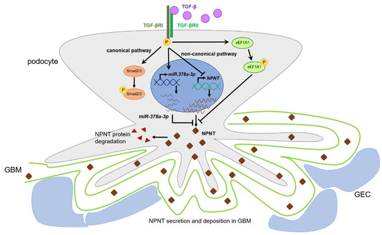 In addition to collagens and laminins, nephronectin (NPNT) is another ECM protein of the GBM. We previously described that podocyte-derived miR-378a-3p and endothelial-cell-derived miR-192-5p downregulate NPNT in podocytes [10,11]. Furthermore, TGF-β upregulated miR-378a-3p and downregulated NPNT, suggesting a TGF-β-mediated miR-378a-3p–NPNT axis [10,12]. Knockdown of npnt/Npnt expression by a miR-378a-3p mimic induced proteinuria, due to impaired integrity of the GFB, with a thickening of the GMB and podocyte effacement in zebrafish and mice [10]. In human membranous glomerulonephritis, miR-378a-3p was upregulated in urine and in glomeruli, whereas NPNT was downregulated, confirming the importance of the TGF-β–miR-378a-3p–NPNT axis in renal pathology. However, miR-378a-3p inhibitor experiments in cultured human podocytes suggest that TGF-β also regulates NPNT independently of miRs [10]. Thus, the TGF-β-dependent regulation of NPNT in the podocyte remains to be discovered in more detail.