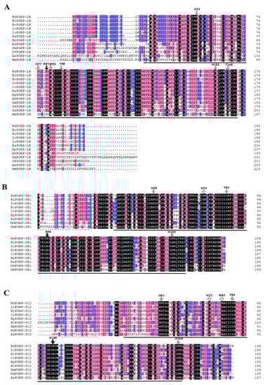 A 564 bp nucleotide fragment of BdPGRP-SC2 was obtained by RACE; the GenBank accession number of the fragment of BdPGRP-SC2 is MW538960. The gene encoded a 188-amino acid protein. Both amino acid sequence alignment (Figure 1) and protein prediction results (Supplementary Figure S1) indicated that BdPGRP-LB, BdPGRP-SB1 and BdPGRP-SC2 all have a type 2 amidase domain, which has been shown to have N-acetylmuramoyl-L-alanine amidase activity. Amino acid sequence analysis showed that BdPGRP-LB, BdPGRP-SB1 and BdPGRP-SC2 all have conserved amino acid Arg, which is necessary for the recognition of DAP-type peptidoglycan [32]. BdPGRP-LB has three conserved histidines, H53, H77, H162, one conserved tryptophan, W83, one conserved tyrosine, Y98 and one conserved threonine, T168, which are required for Zn2+ binding and amidase activity (Figure 1A). BdPGRP-SB1 has conserved H50, H74, H159 and Y85 for amidase activity (Figure 1B). BdPGRP-SC2 has conserved H61, H75, H169, W81 and Y86 for Zn2+ binding and amidase activity (Figure 1C). These results indicate that BdPGRP-LB, BdPGRP-SB1 and BdPGRP-SC2 belong to the catalytic PGRPs. A phylogenetic tree was constructed to determine the evolutionary relationships with PGRPs from several other insect species of Diptera (Supplementary Figure S2). The results show that BdPGRP-LB, BdPGRP-SB1 and BdPGRP-SC2 from different species converge in a clade; respectively, this indicates that PGRP-LB, PGRP-SB1 and PGRP-SC2 evolved independently. In addition, all three BdPGRPs of B. dorsalis were closest to those of B. latifrons in evolution of the three genes (Supplementary Figure S2).