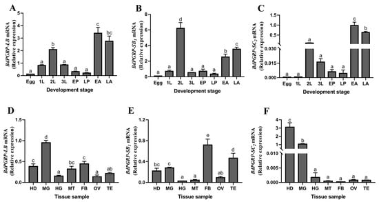 Expression profiles of BdPGRPs in B.dorsalis. (A) Relative expression of BdPGRP-LB at different development stages. (B) Relative expression of BdPGRP-SB1 at different development stages. (C) Relative expression of BdPGRP-SC2 at different development stages. (D) Relative expression of BdPGRP-LB from different tissue samples. (E) Relative expression of BdPGRP-SB1 from different tissue samples. (F) Relative expression of BdPGRP-SC2 from different tissue samples. B. dorsalis was collected at various developmental stages: 1 L, 1st instar larvae; 2 L, 2nd instar larvae; 3 L, 3rd instar larvae; EP, early pupal stage; LP, late pupal stage; EA, newly emergence adults; LA, late adult stage. Different adult tissues were collected: HD, head; MG, midgut; HG, hindgut; MT, Malpighian tube; FB, fatbody; OV, ovary; TE, testis. Multiple comparisons were carried out with one-way analysis of variance (ANOVA) and Turkey’s test in SPSS 16.0. Different lower-case letters indicate a significant difference at the level of p < 0.05 and a confidence interval of 95%. The relative gene expression data were analyzed using a 2−ΔΔCT method and the data were normalized to reference gene Rpl32.